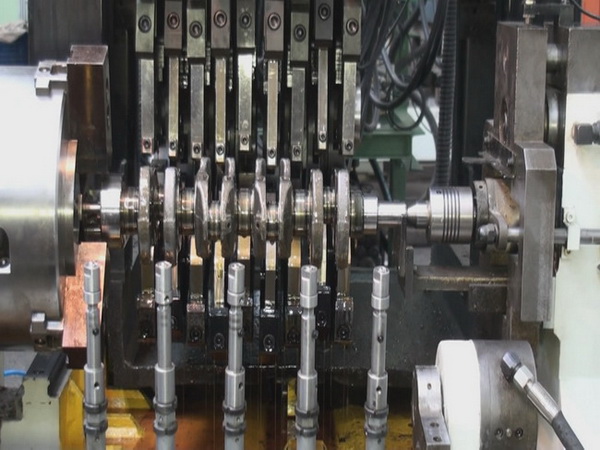 3.滾壓四缸機曲軸:滑臺橫向進(jìn)給,九個夾鉗油缸通過滾壓頭分別夾緊工件上各自對應(yīng)的主軸頸和連桿頸,此時潤滑油開。滾壓時九個夾鉗油缸按預(yù)定壓力進(jìn)行加卸載,按設(shè)定滾壓圈數(shù)完成滾壓。滾壓完成后滾壓裝置退出。